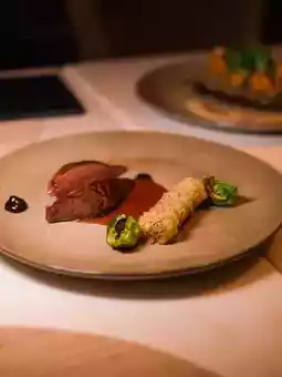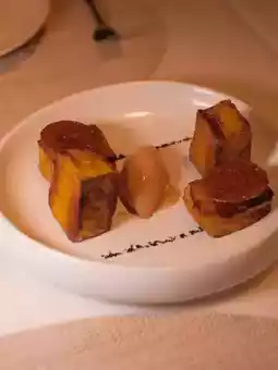 The crispy-skinned, tender pigeon is served with plum sauce and salt. It has the usual flavor of pigeon but the sweet and sour taste perfectly balances the greasiness of the meat, making it refreshing yet flavorful. Next to it is a duck leg wrapped in spring roll pastry with duck liver sauce, creating a well-balanced taste🤩