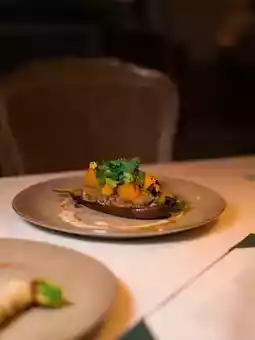 A combination of roasted and fried eggplant textures paired with garlic butter milk sauce.