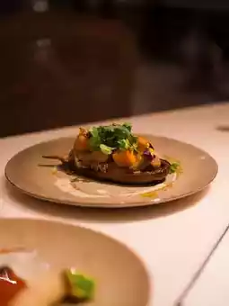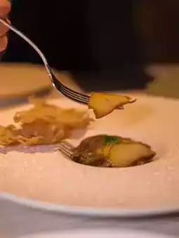 Thinly sliced black abalone served with rich abalone liver sauce and crispy rice crust. The taste is fresh and sweet, with the crispiness of the crust contrasting the tenderness of the abalone, leaving a deep impression😍