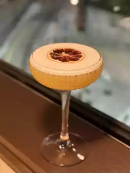 A gin-based cocktail mixed with elderflower liqueur, honey, orange juice, citrus, Indian snack sweet and sour spice powder (chaat masala), Indian black salt, and egg white. The drink has a rich layered taste, spicy and slightly hot with a fresh sweet and sour finish, smooth in texture, full of exotic charm.