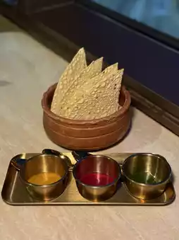 Traditional Indian fried thin crackers served with three types of Indian sweet and sour chutneys, including mango, mint, and beetroot sauces. The flavors are natural with a hint of Indian spices.