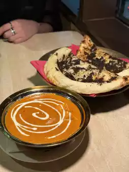 Fresh tomatoes are slow-cooked until caramelized, then combined with cheese and various spices like fenugreek and Indian cardamom. The sauce is creamy and rich, perfectly matched with soft Indian naan bread!