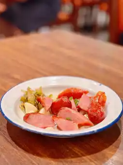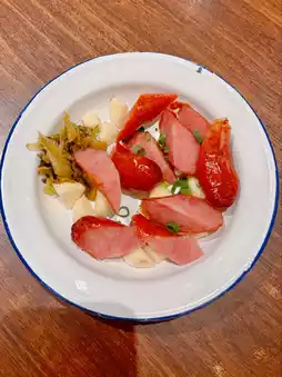 Garlic Taiwanese Sausage 🍖 A la carte $58 💰 The Taiwanese sausage has a garlic aroma and a honey flavor 😛 Very juicy 😬 Served with garlic and pickled mustard greens for extra appetite 🧄