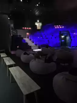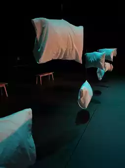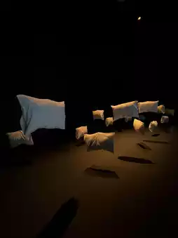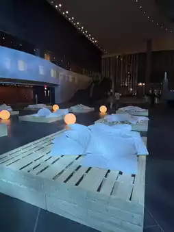 🏖️ Environment/Facilities: The "Sleepless Night" installation features two light and shadow experience devices. The first is "Sleepless City" located in the atrium, which uses sensors to capture real-time train movements and synchronously triggers projections inside the venue. The train images swiftly glide across the white walls on both sides of the atrium, seamlessly connecting with the real scene outside the windows. The flowing light is dazzling, creating a dreamlike atmosphere. The other installation uses the stage as a backdrop, switching the audience's perspective to that of performers. Sitting on the stage and looking at the twinkling lights in the audience seats offers a unique feeling. Pillows beside the stage interact with visitors by playing lullabies from different eras and countries.
