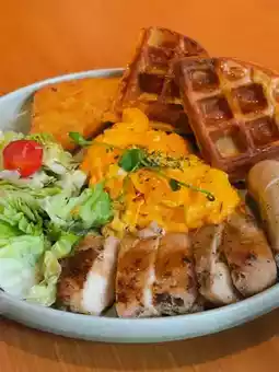 👉 Juicy tender chicken steak! Served with scrambled eggs/salad/roasted tomato, very generous portions