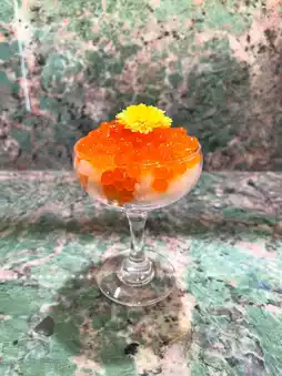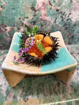 The purple sea urchin has an orange-yellow color, smooth texture, and sweet flavor, with slightly salty salmon roe.