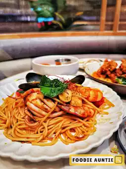 🍝 For the main course, chose "Tom Yum Rich Sauce Tiger Prawn Spaghetti," tiger prawns are bouncy and peeled, lots of squid, spaghetti coated with sour and spicy Tom Yum sauce, a fusion flavor balance.
