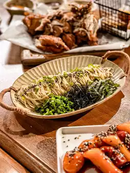 A personal favorite! Korean cold noodles served with black sesame soy milk. The soy milk broth is cool and smooth, rich but not greasy. Guests can adjust salt or sugar to their preferred salty or sweet taste, an authentic Korean way to enjoy it.