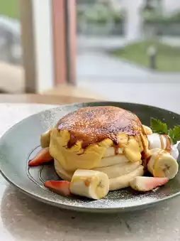 This dessert already makes you happy just by looking at it💞. The two layers of soufflé pancakes are super fluffy with a rich egg flavor. On top, there’s tiramisu cream and some chocolate crunch between the cream and pancakes, which is definitely the icing on the cake❣️. There’s also a cream cone with a very crispy texture.
