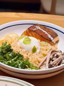The salmon is honestly cooked very well, achieving a crispy skin and perfectly cooked center🐟. The tamago tofu is lightly pan-fried. The risotto is full and each grain is distinct. Mixing it with the onsen egg makes it even more delicious.