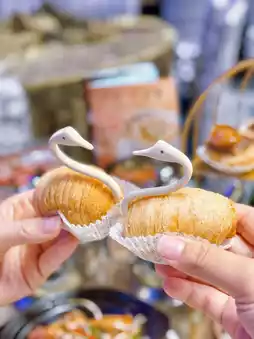 The presentation is really exquisite, with the birdcage design showing great thought. The dim sum varieties include shrimp dumplings, siu mai, fish puff buns, swan puffs, phoenix eye dumplings, and pumpkin balls. Each piece is small, allowing you to try different flavors. I especially liked the swan puffs and pumpkin balls. The swan puffs have shredded radish inside, which tastes sweet and has a nice texture, while the pumpkin balls are filled with my favorite custard filling. Pumpkin and custard go perfectly together, with a sweet taste.