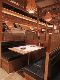 Near the entrance is the self-service area, mostly wooden booth seats,