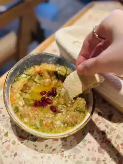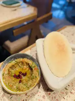The charcoal-grilled eggplant puree is so smooth🔥 Mixed with diced bell peppers and parsley, combined with olive oil, it has a rich oily aroma yet a refreshing tangy taste🍀~ Perfect to spread on hot Pita bread.