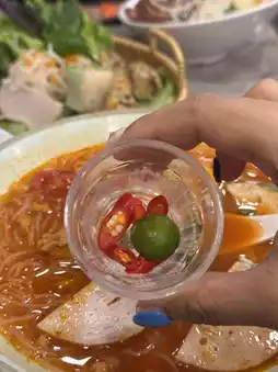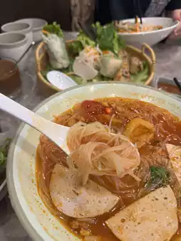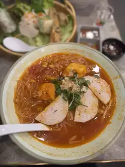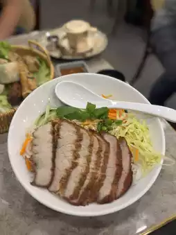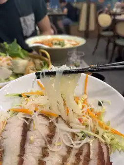 Combining sour, sweet, salty, fresh, fragrant, and spicy flavors, the overall taste is refreshing and appetizing. The pork neck is fragrant and tender, with the aroma of marinade. The pork neck is marinated (with fish sauce, lemongrass, garlic, lime juice, etc.), then pan-fried or grilled to have a slightly crispy exterior and tender, juicy interior. It has a salty, garlicky, lemongrass freshness, and a slight sweetness. The dry noodles are smooth and light; Vietnamese dry noodles are naturally mild and slightly sweet, with a smooth texture that absorbs the sauce and other ingredients well. The fish sauce sweet and sour dressing is the soul sauce.