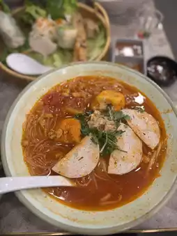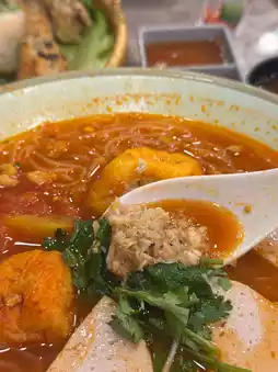 When eating pho, you must appreciate the broth. Take a sip of the rich and fresh crab tomato broth, with a prominent crab flavor and the sweetness of tomatoes, combined with Vietnamese spices and coriander, plus an appropriate amount of lime juice to enhance freshness and chili 🌶️ for spice lovers to try. Stir-fried pork bits make the broth even more fragrant and rich, tofu puffs absorb all the essence of the soup, making you want to take bite after bite. The pork roll is chewy, and the pho noodles are slightly firm, pairing perfectly with the tomato crab meat broth.