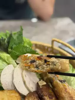 Vietnamese Fried Shrimp Cake: Fried to golden crispiness, generously sized, with firm and bouncy shrimp 🦐 meat. Dip it in Thai chili sauce for a perfect sweet, sour, and spicy match. The spring rolls are finger-licking good, made with wood ear mushrooms, pork, vermicelli, and radish for extra bite, leaving a lingering fragrance. The hot meat juice bursts out with each bite, so be careful not to burn your mouth.