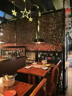 This Korean restaurant has a notable background, originating from a fried chicken brand in Busan, South Korea. It specializes in authentic Korean cuisine. The interior is spacious and comfortable, adorned with a romantic atmosphere featuring love locks hanging on wire mesh and star-shaped pendant lights on the ceiling.
