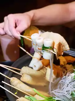 Served on a hot stove to maintain its temperature, the clear and light broth is incredibly flavorful. It includes skewered fish cakes, fish paste, and chikuwa, which are tender, bouncy, and absorb the broth well. Additional ingredients include translucent glass noodles, crisp and tender Chinese lettuce, sweet and soft white radish, enoki mushrooms, and wood ear mushrooms. You can also dip them in Korean-style sauce for extra flavor.