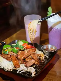 The thick slices of pork neck are particularly satisfying, with the right amount of fat and connective tissue. The meat is tender and delicate, infused with a rich soy sauce aroma, and accompanied by enoki mushrooms, onions, and chili peppers.