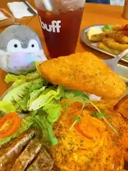 As for the food, the focus is on Western-Japanese fusion cuisine✅ The variety is diverse and creative🤗 The must-try all-day breakfast is generously portioned, paired with fresh salad, milk-fried crab, teriyaki chicken steak, and Munich sausage. The texture layers are rich, and you can taste the care in every bite😚