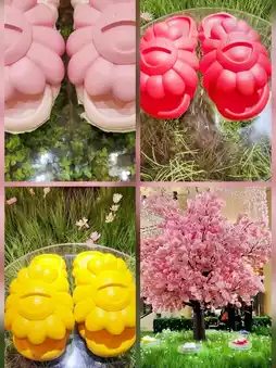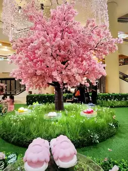 The limited store transforms into a dreamy garden, combining sunflowers and vibrant colors, along with a cherry blossom mirror wall and eye-catching large hanging floral art installations, as if you are in a sea of flowers and forest encountering colorful sandals left by a fairy. A must-visit spot for photos!