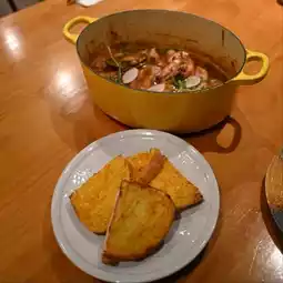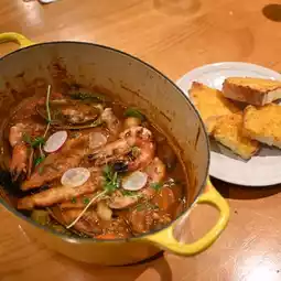 The French Marseille fish soup is very rich, paired with tender Spanish red snapper, fresh mussels, and springy large shrimp. You can dip bread into it, creating a rich texture😋