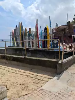 The gentle waves and scenic green hills create a relaxing atmosphere, while the long stretch of soft sand is great for sunbathing or beach walks 🌴. Lifeguards are on duty, making it safe for families and beginners in water sports 👨👩👧.