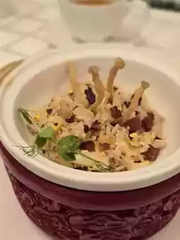 The "Braised Farm Chicken with Porcini Mushrooms and Tangerine Peel" resembled pork belly at first glance. The meat was slightly chewy and carried a strong aroma of tangerine peel marinade, making it feel nourishing.
