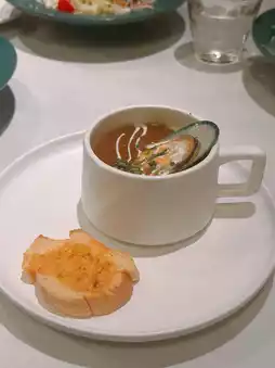 French Lobster Seafood Chowder🦞 Add-on $22💰 The lobster flavor is a bit mild and the texture is a bit thin🥺 Served with toast🥖
