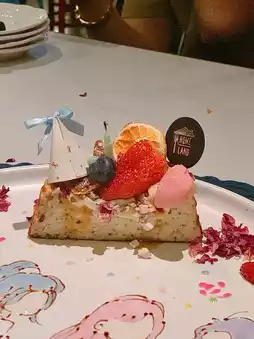 Earl Grey Basque Cheesecake with Painted Plate🍰🎨 A la carte $153💰 The Earl Grey Basque cheesecake has a stronger cheese flavor😛 with only a slight Earl Grey taste🥲 Served with mixed berries🍓🫐🌹 quite refreshing☺️ When booking in advance, specify to paint four girls👭🏻👭🏻 and it comes with one instant photo📸