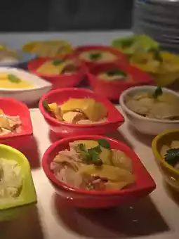 The Hainanese chicken rice is made into mini portions, which is convenient for everyone to carry. The Hainanese chicken with crispy skin and tender meat is equally delicious with its own three-color sauce.