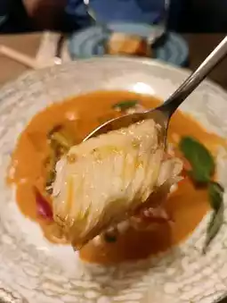 The crispy skin and tender, smooth fish, complemented by the fragrant red curry, create a perfect accompaniment.