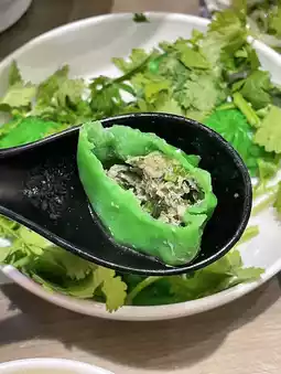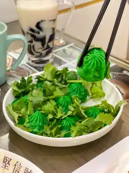 The entire plate is generously brimming with coriander, and the green-skinned xiaolongbao is a real eye-catcher. The flavor is similar to regular xiaolongbao, but with a subtle coriander aroma, making it even better than expected.