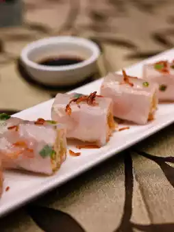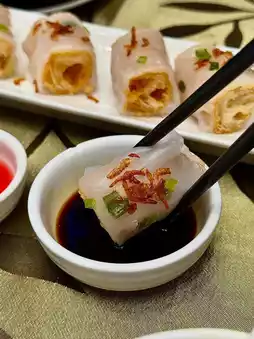 Deep-fried until golden and crispy, the rice noodle rolls remain tender and smooth. The sakura shrimp and green onions add a touch of aroma, perfect for dipping in soy sauce!