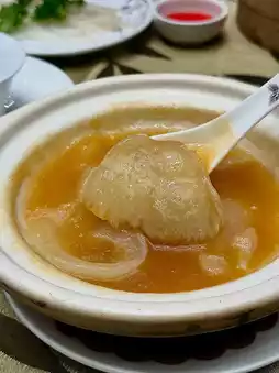 🌟 Braised Clay Pot Shark's Fin features premium, thick, distinct shark's fins weighing 300 grams, simmered slowly in a secret abalone sauce. The broth is perfectly thick, and the shark's fin melts in your mouth with a rich, gelatinous texture—a classic Cantonese dish! Add Zhejiang vinegar to enhance the flavor, and add silver sprouts for a more complex flavor.
