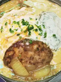 Cheese🧀Waterfall Curry Hamburger Steak Rice is a double enjoyment of sight and taste👅, hot cheese and 🍳scrambled eggs flow down like a waterfall💦, covering the whole curry rice🍛 and burger steak, the picture is shocking🤩! The burger steak is juicy, rich and delicious 🔥, with smooth cheese🧀, every bite is full of rich cheese and curry flavor✨, and it is made of iron plate🍳, hot so there will be a little rice crust at the end😋.
