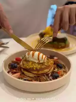The hotcakes are so fluffy. Topped with passion fruit jam, they're so tart and sweet, and really appetizing! 🤤