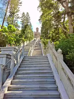 🛕Visit the Big Buddha, or Tian Tan Buddha, a prominent landmark in Hong Kong. Nestled amidst tranquil nature, visitors are greeted by a grand, imposing archway. A lotus pedestal stands at the front, believed to energize visitors and bring good fortune. The temple grounds are lush and green.