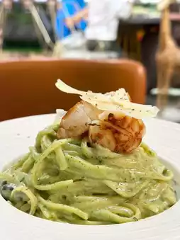 This plate of spaghetti is really full of surprises! The green sauce is rich and flavourful, the scallops are tender and bouncy, the spaghetti is cooked just right, and the salty flavor of the cheese makes every bite delicious!
