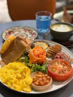 The deluxe breakfast is really satisfying! Including baked tuna brown mushrooms delicious and juicy, smoked salmon fresh enough, German pork sausage smoky flavor, delicious bacon, scrambled eggs soft and tender, fresh tomatoes, crispy potato cakes crispy outside and soft inside, ketchup baked beans warm heart, Danish toast crispy! All combined together, rich flavor layer, immediately full of energy after eating!