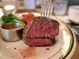Australian Wagyu Beef Sirloin: Broccoli sprouts, Spanish red peppers, roasted potatoes, duck liver and brandy sauce. The Wagyu beef is cooked to medium rare, tender and charred.