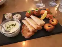 Pastry Platter: Fried salmon balls in white sauce, smoked salmon, mini egg pie, tuna tartare, cucumber and herb dipping sauce