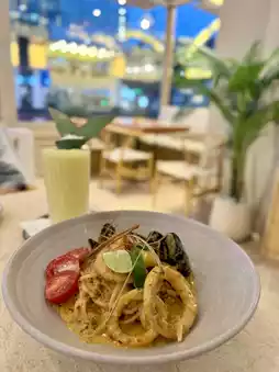 As for drinks, the Mango Sticky Rice Coconut Milk Smoothie and the Iced Thai Tea with Golden Ratio were both excellent choices. The smoothie had a rich mango flavor and included chewy bits of sticky rice, offering a delightful texture. The Thai tea had a perfect balance of tea and milk flavors, with just the right amount of sweetness.