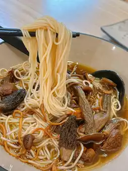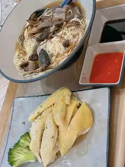 The Hainanese chicken is tender and boneless, making it a convenient meal. 🐔 Dip it in Hainanese chicken dark soy sauce and chili sauce for an even more delicious flavor. 🍜 Paired with the fragrant chicken noodle soup, the broth is infused with five-color mushrooms, creating a sweet and savory mushroom broth with a natural mushroom aroma. The overall flavor is refreshing and healthy, and the noodles are thin and slippery.