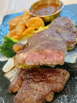 The steak is seared to perfection, with a lightly charred exterior and a juicy, pink interior. The beef flavor is rich, and the aroma of the sizzling hot plate makes it even more appetizing. Served with stir-fried vegetables and crispy potato wedges, it's a satisfying and filling meal.