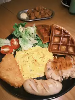Super rich 👏! Maple waffles are slightly crispy and sweet 🧇, teriyaki chicken steak is tender + melted milk scrambled eggs 🍳! Munich sausage is salty, the fries are crispy ~ the salad is fresh enough 🥗, two girls share to eat just right 😝 ~