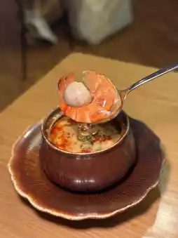The Tom Yum Goong soup is incredibly flavorful, with a rich, sour, spicy, and fragrant flavor that's both appetizing and delicious. The ingredients are quite generous, including prawns and straw mushrooms.