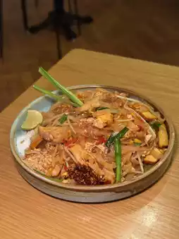 The Phnom Penh vermicelli is stir-fried to a perfect wok aroma and paired with tender chicken, scrambled eggs, dried tofu, bean sprouts, chopped peanuts, chopped chili peppers, and sugar. Seasoned with lime juice, it has a sweet and sour, refreshing flavor!