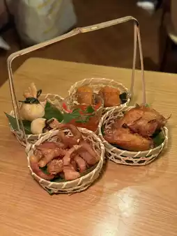Golden fried shrimp cakes are crispy on the outside and chewy on the inside; the pork strips are savory and flavorful; the fried chicken wings are juicy and have a strong lemongrass flavor; and the lucky bags are fried to a golden brown and filled with a generous, rich shrimp filling.