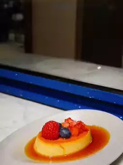 Amber-colored caramel drizzles over a smooth custard sauce. Flavored with vanilla seeds and lemon zest, it has a perfect sweetness and a silky texture.